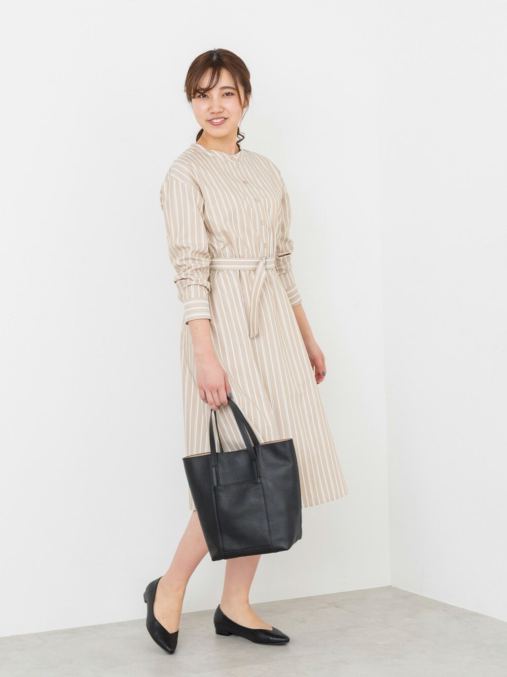 1枚でキレイ見え。上品ベージュに清潔感のあるホワイトストライプのワンピースなら、オフィスにも、休日のお出かけにも、小物次第で簡単コーデが叶います。オフィスなら、黒小物で全体を引き締めて大人顔に。