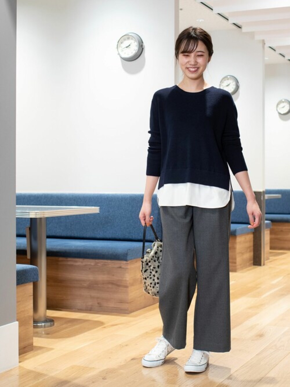 着るだけ簡単♪どれくらいヘムラインを出すかで表情が変わるので、バランスの難しいレイヤードスタイルも、1枚でレイヤードしたようなデザインに仕上がっているのが最大のポイント♪どんなボトムスとも相性の良い着丈バランスなのも心強い。少しリラックスな気分の今なら、ワイドパンツに足元スニーカーで抜け感を出すのもおすすめ。