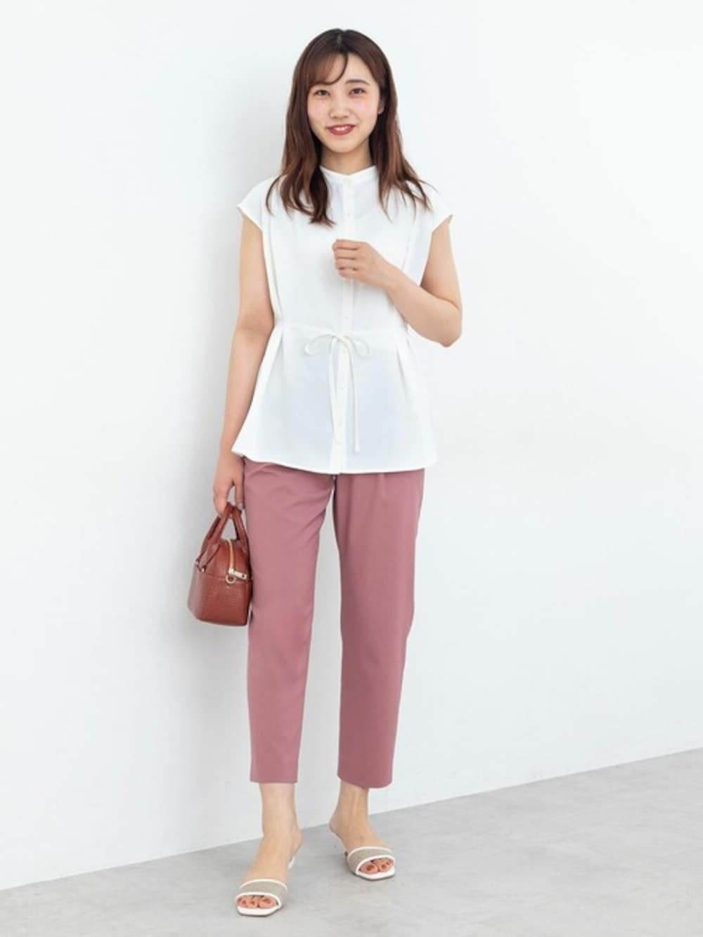 程よいハリ感としなやかさがあり涼しげな表情のブラウスは、チュニック丈で気になるヒップラインもカバー♪カラーパンツとあわせて今年らしい雰囲気に。ストレッチがきいているカラーパンツは、動きやすいので着心地もよくデイリーに活躍してくれます!