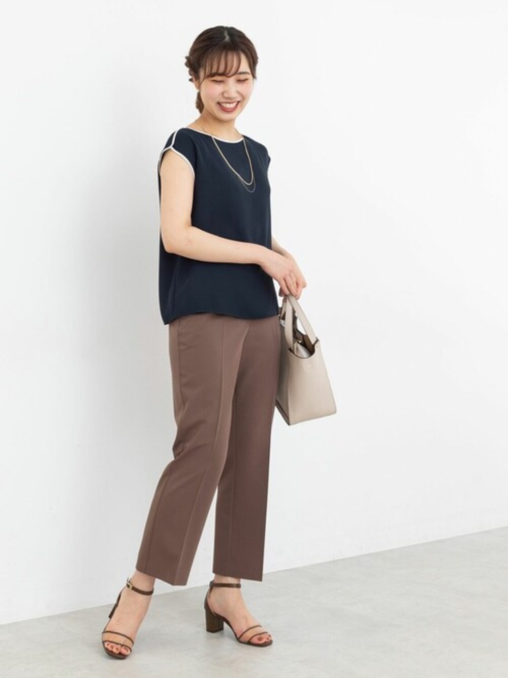 ネックラインとスリーブラインにパイピングが入ったバイカラーがポイント。とろみのある上品な印象のブラウスは、シンプルなコーディネートにメリハリをつけてくれます。ブラウンのパンツをあわせることで鮮度アップ!