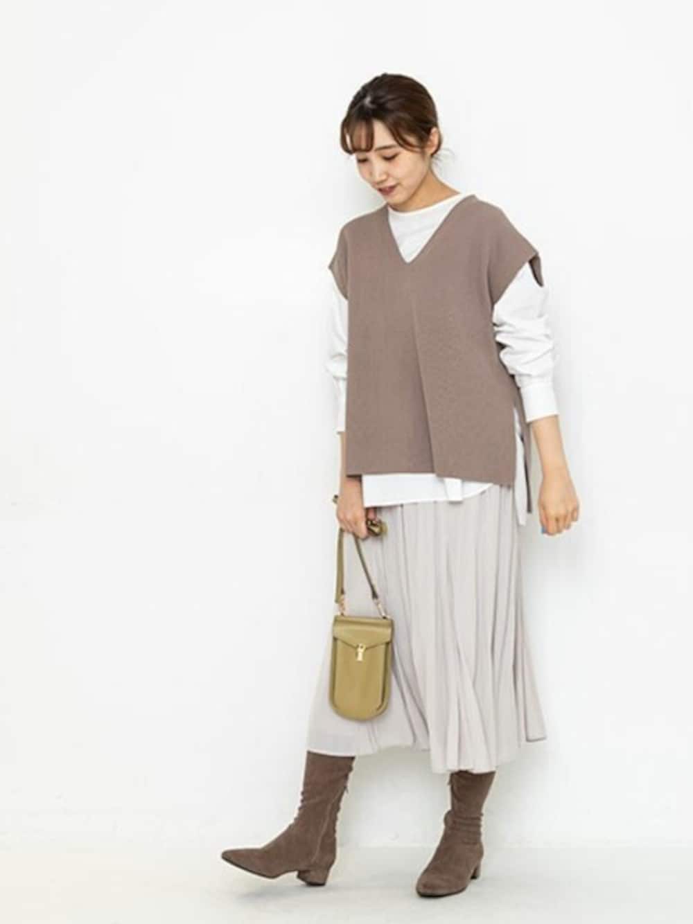 白×ベージュの上品トーンでレイヤードしたニットベストには、ふんわり女性らしいスカートを合わせてきれいめカジュアルスタイルに。オーバーサイズのチュニックブラウスとニットのレイヤードでリラックス感もあり程よい抜け感がポイントです。