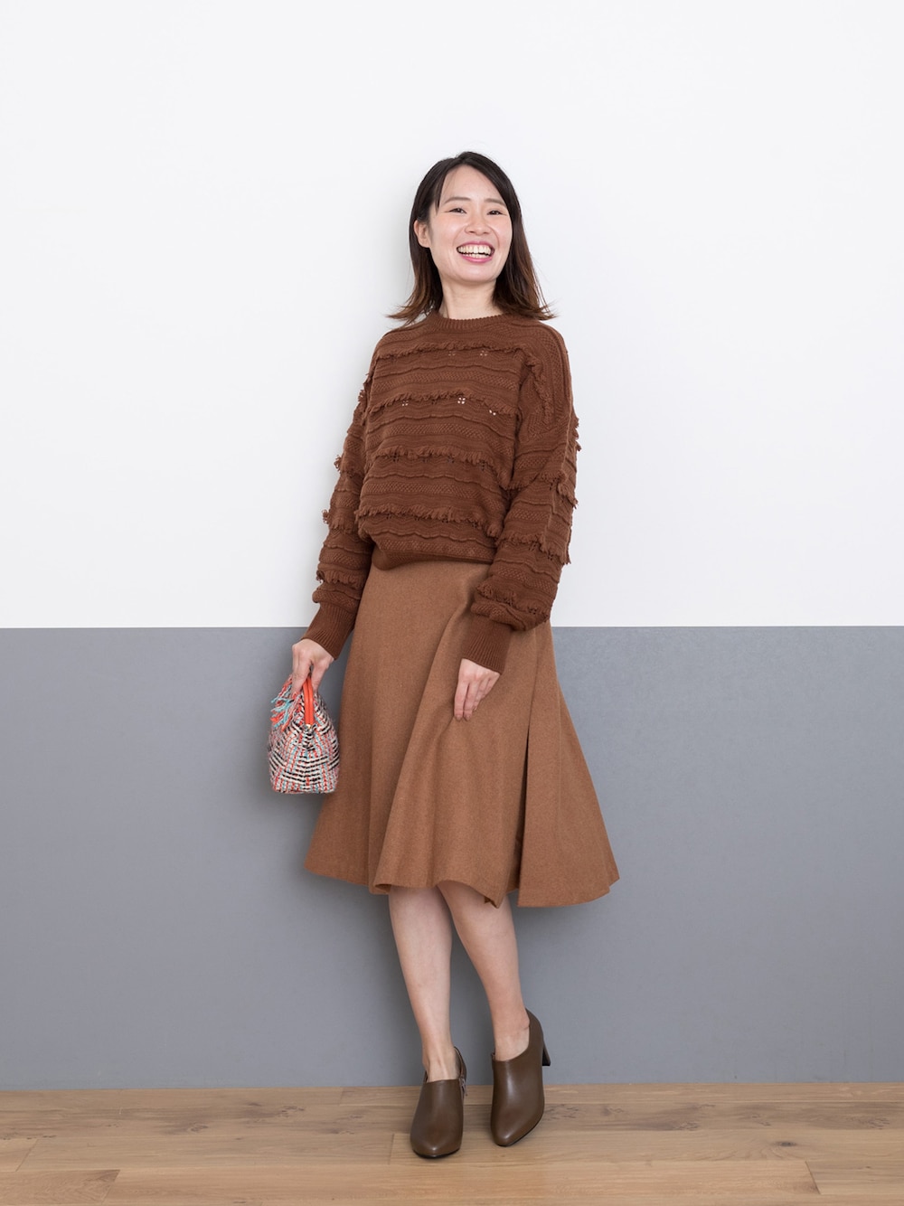 地柄ボーダーにフリンジ使い、袖口のボリューム感と今年らしさの出るニットは、少し短丈でバランスがとりやすいのでボトムを選ばないのも嬉しいキャッチーな1枚!