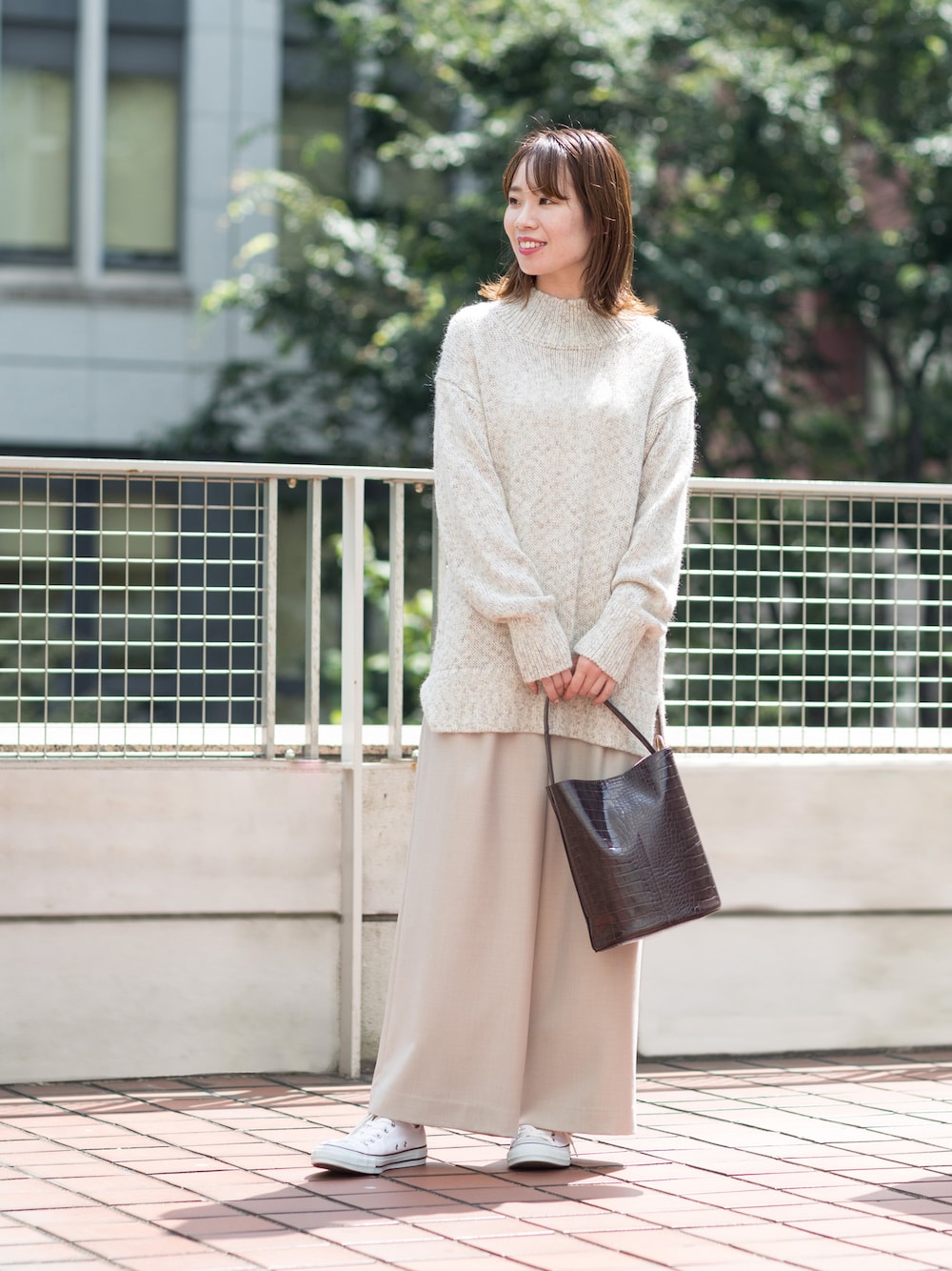 今年らしいメランジニットは少し大きめのゆるっとシルエット。今っぽいレイヤードスタイルにするならワイドパンツがMUST。ベージュを重ねたワントーンコーデで決まり。