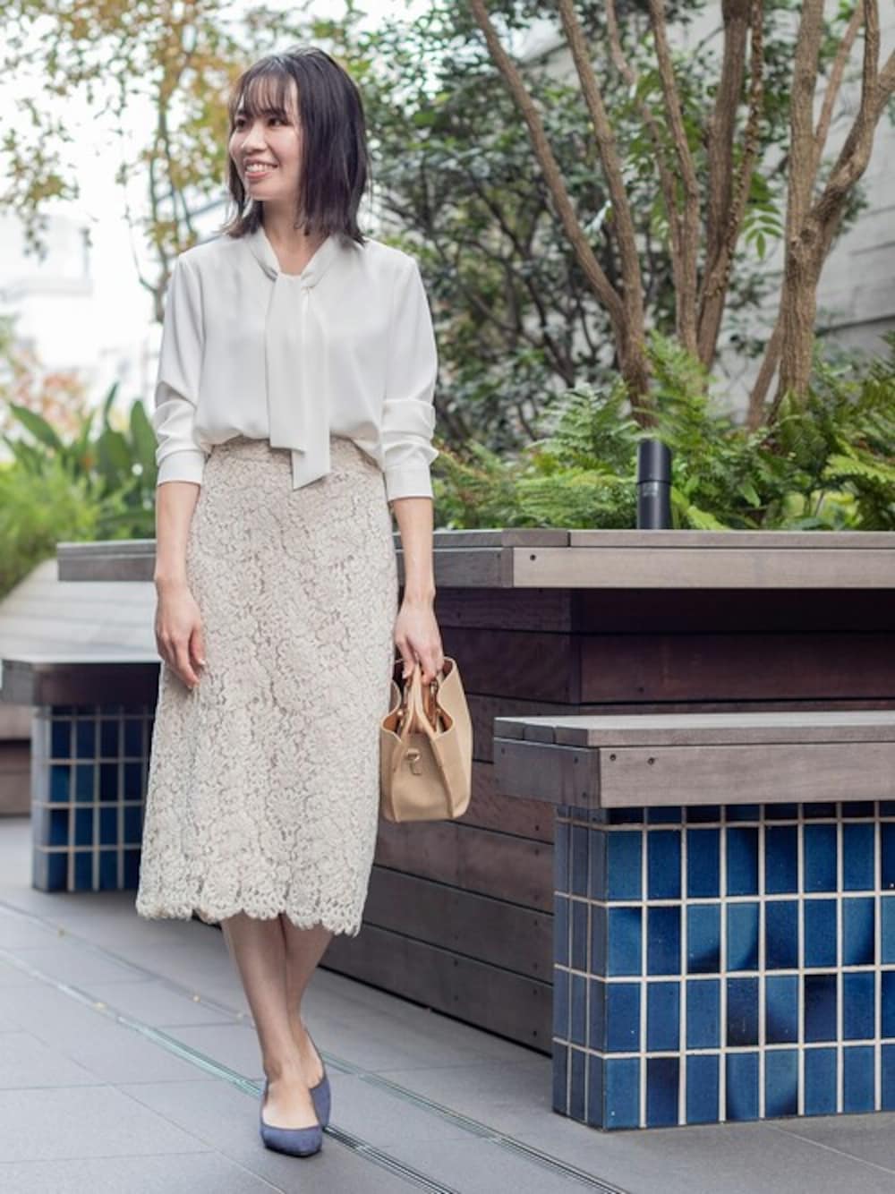 スカラップレースのスカートは、ストレートラインで上品見え。オフホワイトのブラウスと合わせれば大人顔のオフィススタイルに。ブラウスは人気のボウタイデザインでレースの甘さを緩和して。オフィスにはもちろん、オケージョンシーンにも活躍♪