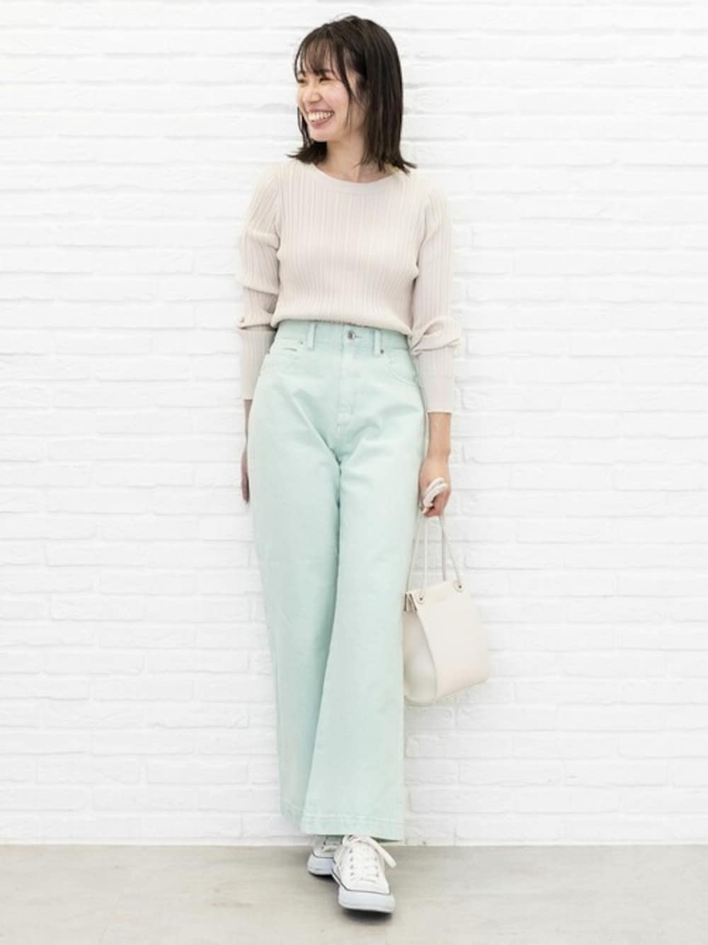 淡いトーンでまとめるきれいめカジュアルコーデ。優しい印象のライトグリーンはデニムで取り入れるのが新鮮♪爽やかさをひとさじ加えて、春気分を盛り上げてくれるコーディネート。
