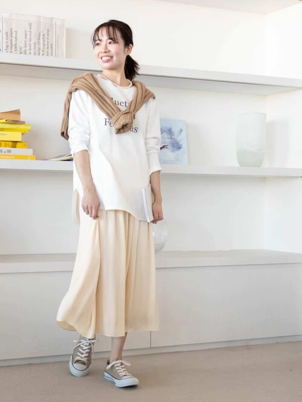 軽やかなギャザースカートをコーディネートにプラスするだけで、一気に春気分が盛り上がります。ベージュやブラウンとも相性のよい黄みのあるオフホワイトなら、冬アイテムとも合わせやすいので、ちょっと早めにチェック!休日のカジュアルシーンでは、レディにでも動きやすいリラックス感を。オーガニックコットンのロゴTは着心地もよく春スタイルに活躍しそうです。