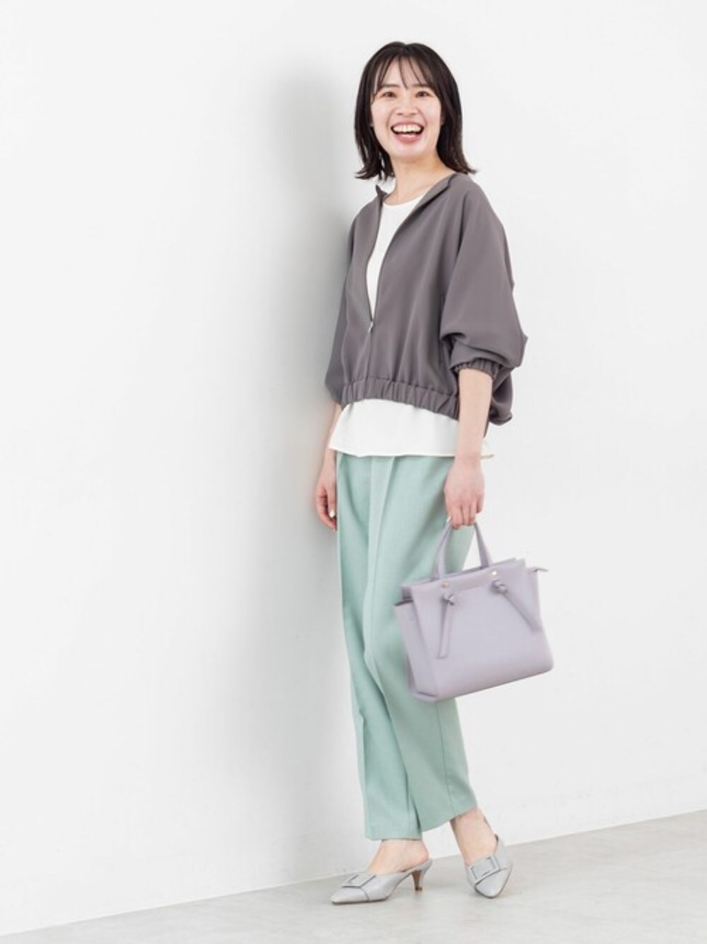 落ち感のある素材でボリュームのあるスリーブでこなれ感のあるジップアップブルゾンの渋めカーキに、リネンライクのミントカラーのパンツをあわせて、爽やかでクールな大人のオフィスコーデに。
