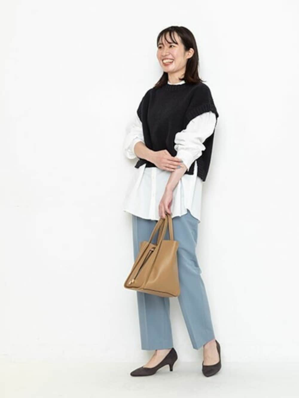 ニット×シャツのレイヤードスタイルも、着るだけでBESTバランス♪今年のニットベストは少しショート丈がポイントです。ペールブルーが目を惹くカラーパンツと合わせて、きれい見えに仕上げた大人カジュアルスタイルに。
