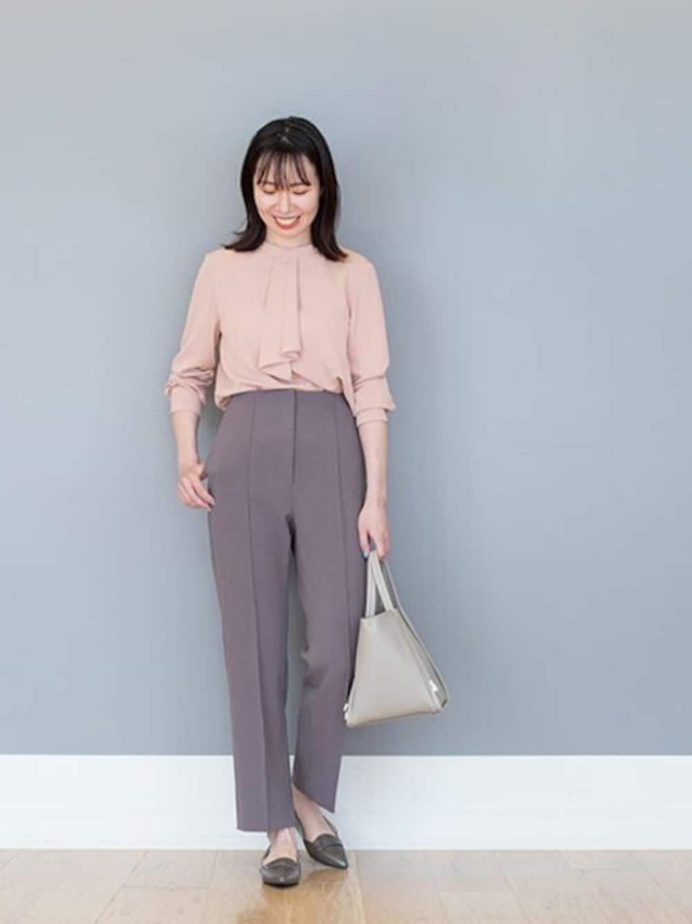 お仕事スタイルにぴったりのしなやかな女性らしいブラウスは、胸元に華やかなラッフルデザインがあるのでジャケットインとしても着映えします。ラッフル部分が身頃に固定されているので前かがみになったときも、だらっと垂れてこない仕様もこだわりポイントです。愛らしいピンクはパンツスタイルでシャープさもプラス。