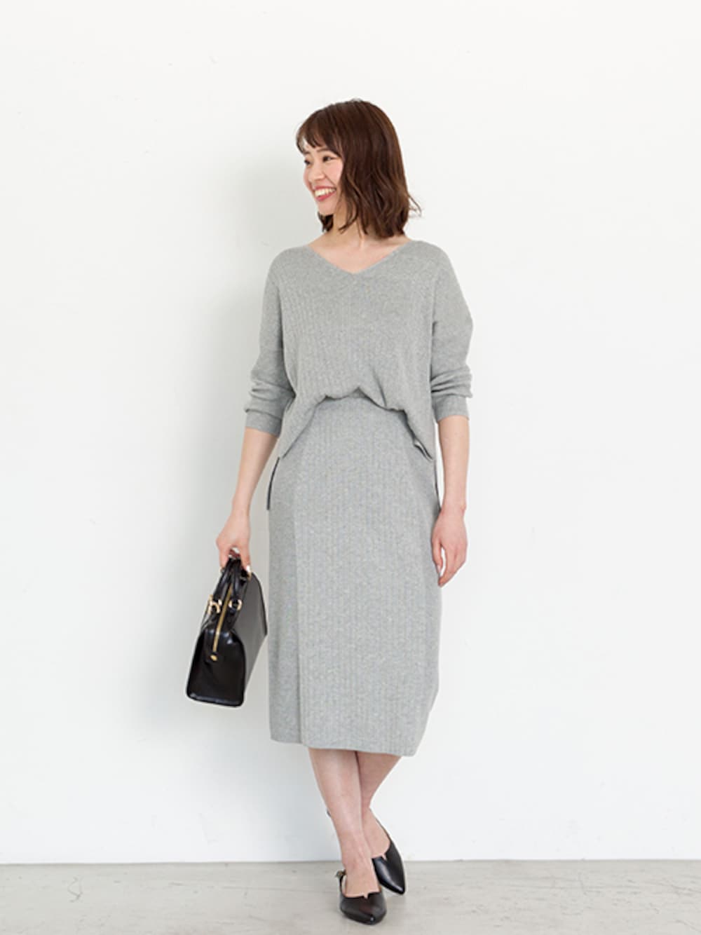 女性らしく決まる!ワイドリブのニットセットアップ。 上下セットではもちろん、ニットとスカートとして、単体でも着やすいところもオススメです♪