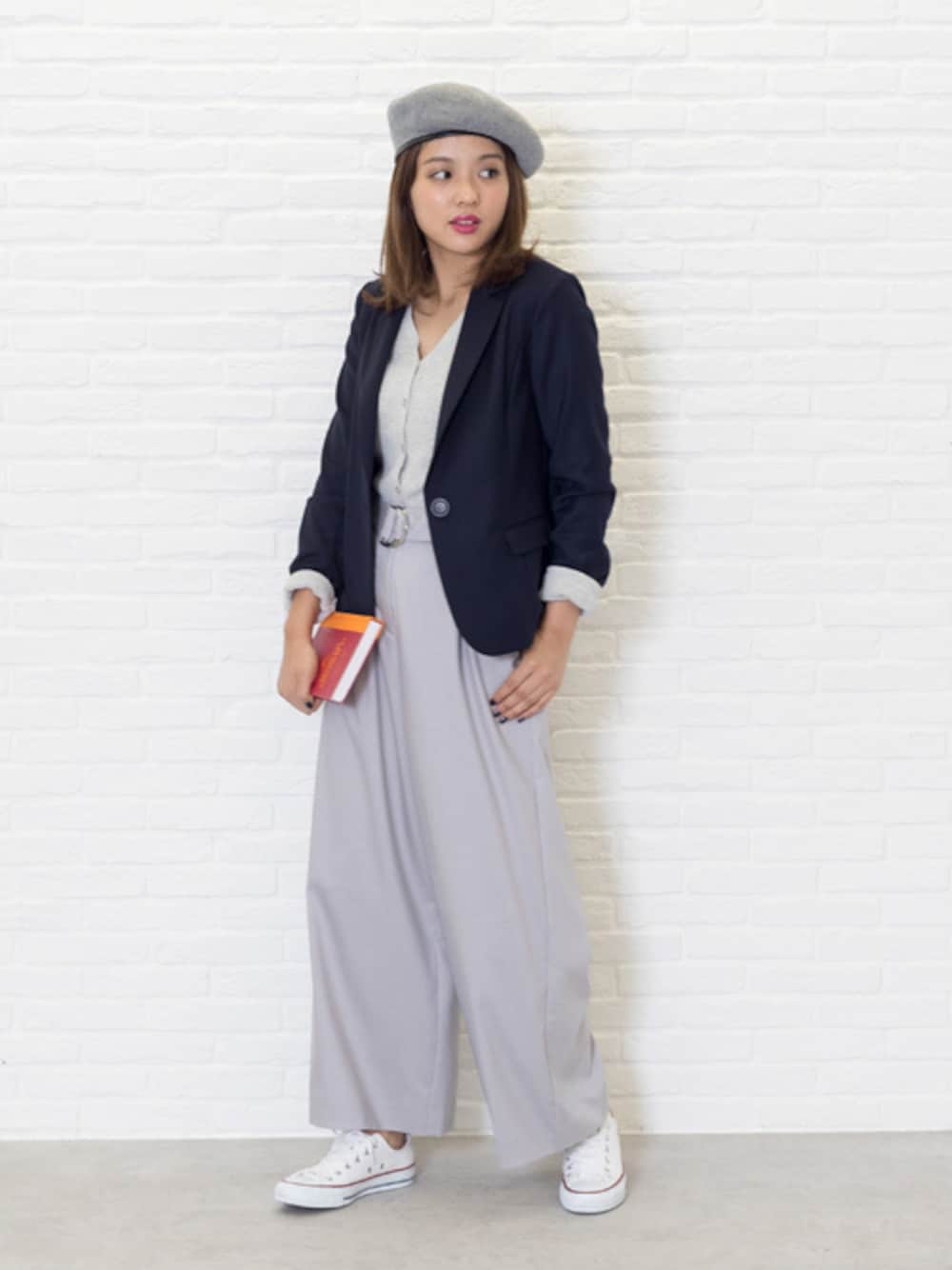 < ハイカウントドビーセットアップ 着回しコーデ > 休日ジャケットスタイルは、ベレー帽やスニーカーを合わせてカジュアルに。