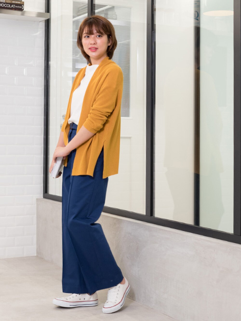 さらりと羽織るカーディガンは紫外線対策&冷房対策で出番の多い季節。使える1枚を手に入れたい。王道カラーもいいけれど、次に抑えるならオトナ顔マスタードはいかが?インディゴブルーをより鮮やかに引き立ててくれます。