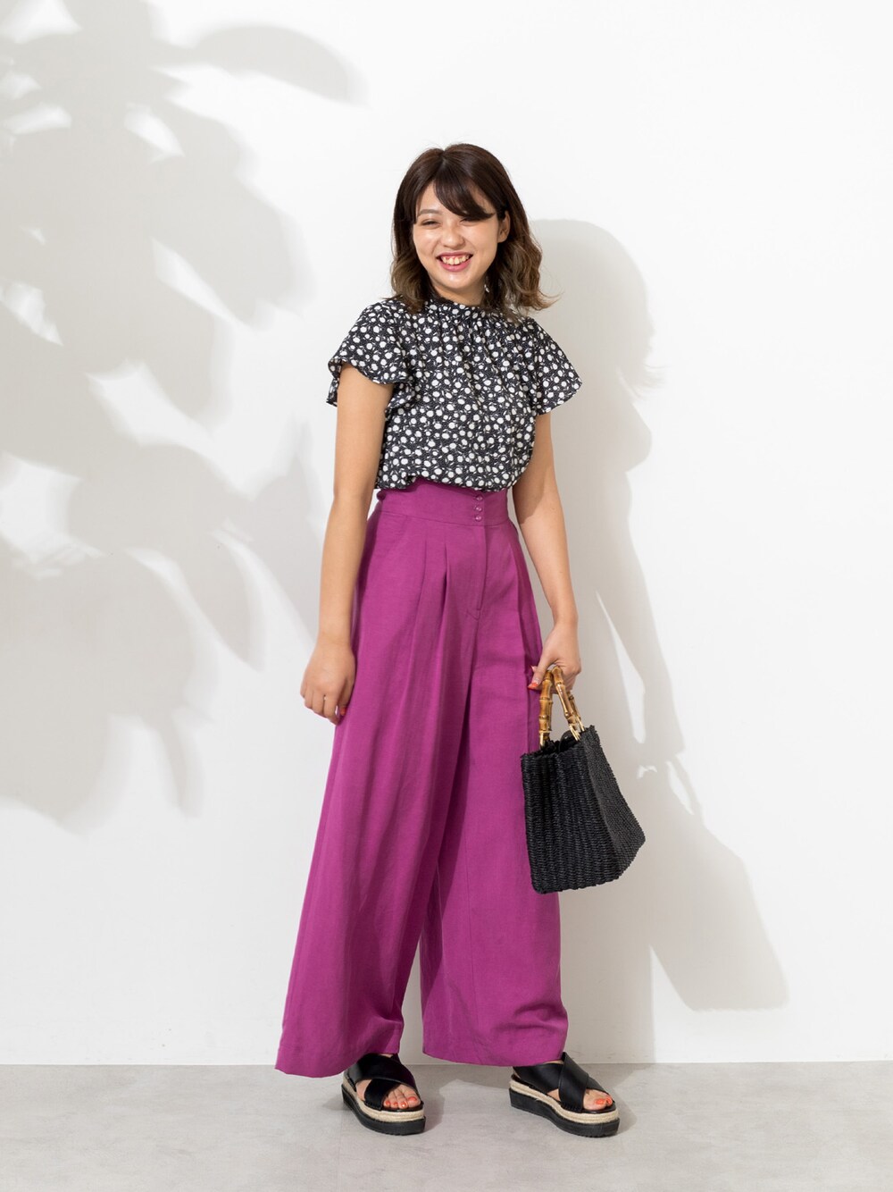 カラーボトムスに挑戦したい今夏。鮮やかなローズピンクのワイドパンツは、タックをとってボリュームをだし、軽やかでこの季節履き心地の良い1枚。小花プリントのブラウスをインして少しレトロな空気を纏わせて。