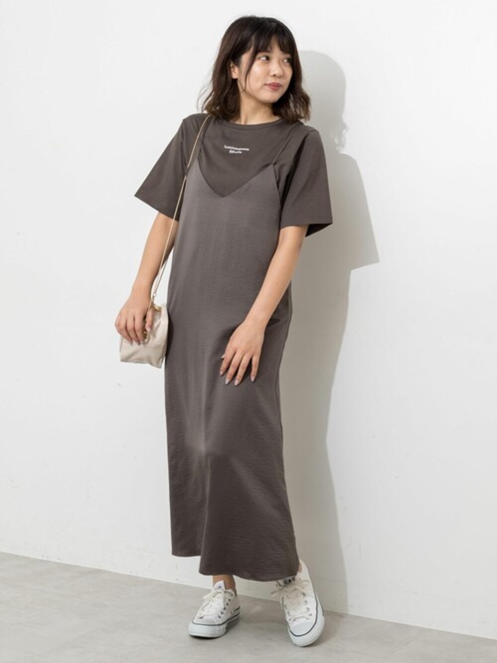 シックなワントーンカラーでまとめた大人カジュアルコーデ。ほんのり光沢感のあるサテン生地を使用しているのでTシャツやスニーカーなどカジュアルアイテムを合わせても子供っぽくなりません。