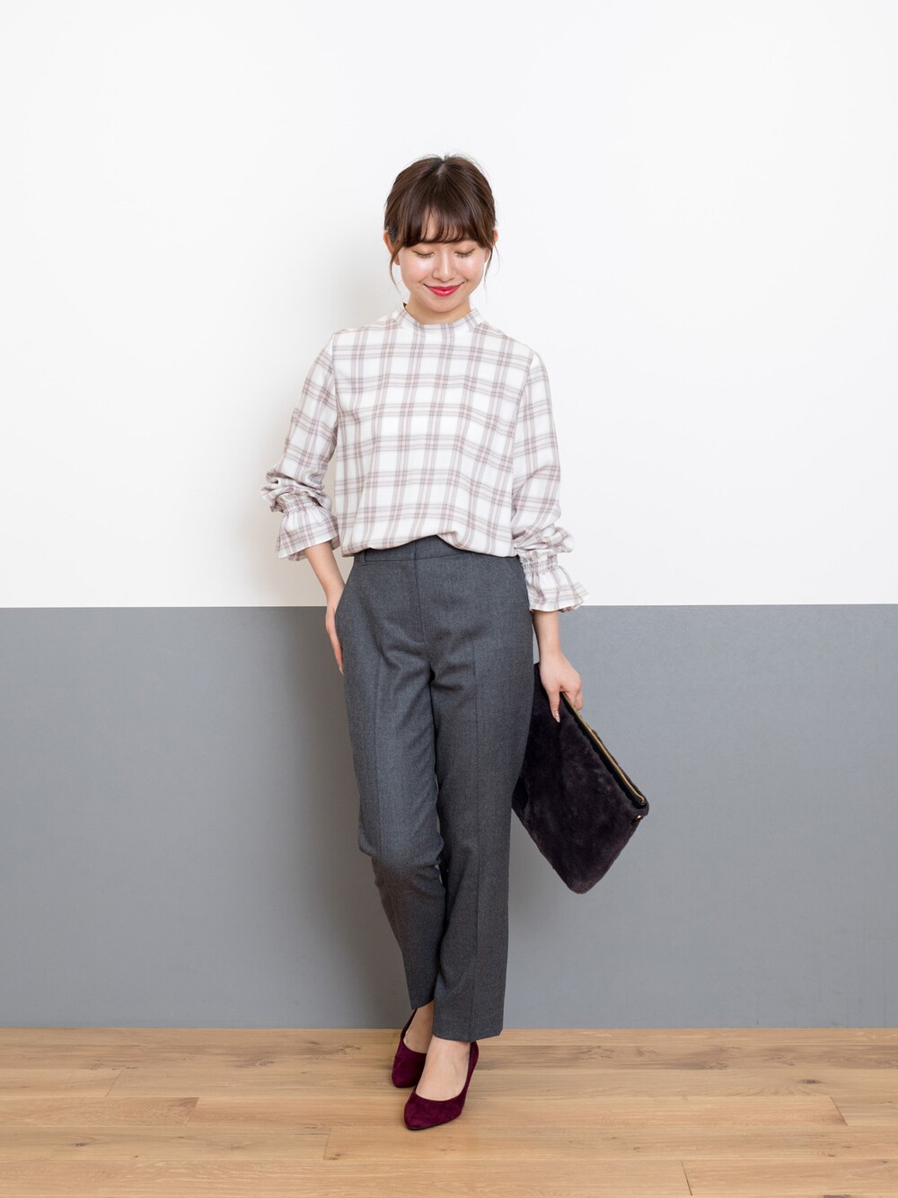 きちんと通勤パンツは、落ち着いたカラーで大人も取り入れやすい♪キャンディースリーブトップスを合わせて女性らしさをプラス。