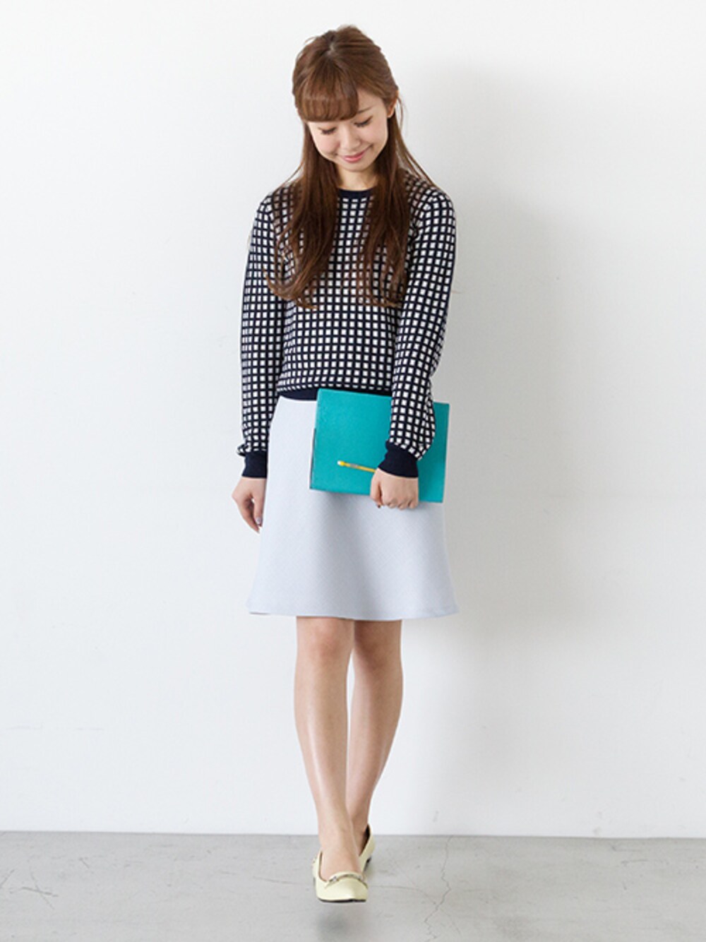ブロックチェックがかわいいジャガードニットは オフィススタイルにもぴったり。 イエローのフラットシューズをアクセントに。