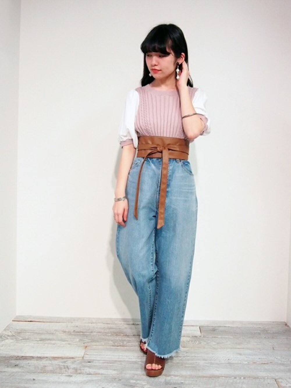 袖を切り替えて、ジレをレイヤードしているようなニットプルオーバーを主役に トレンドのサッシュベルトとデニムワイドパンツで、シンプルに仕上げたスタイルング。 二の腕がカバーできるうれしいアイテムです。 179/WG