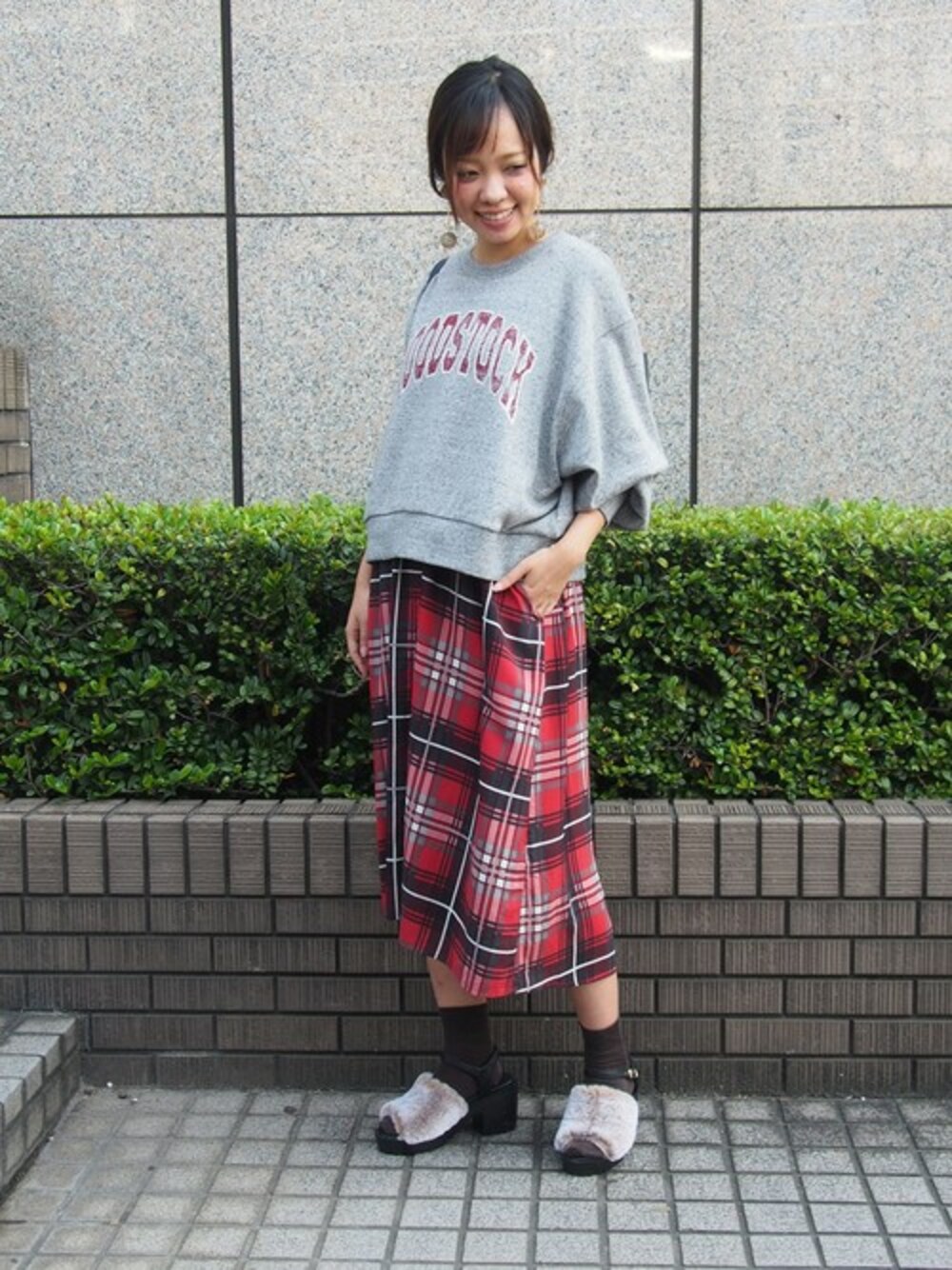主役級のカラフルなチェックシャツワンピースにスポーティなスウェットをON。 上級ミックスコーデの完成です!