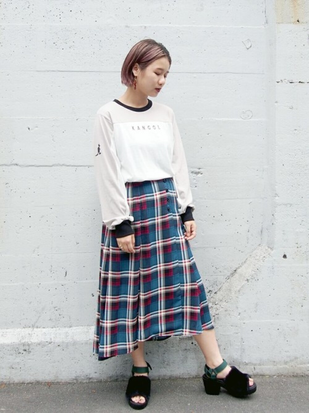 KANGOLコラボ秋の新作 配色ロンTEE レトロ感UP チェック柄のマーメードスカート合わせで 秋を先取り 179/WG