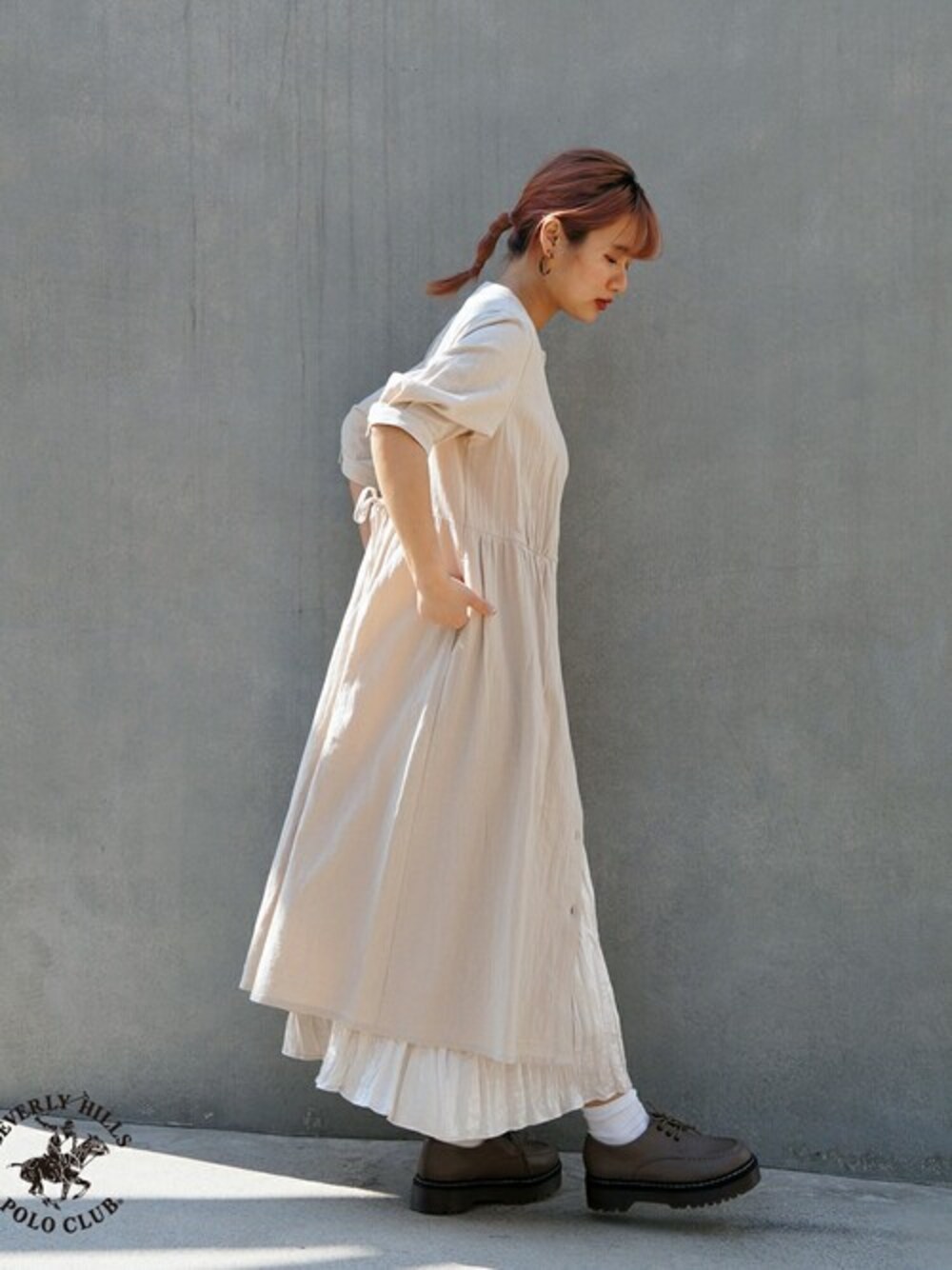 ニコルのワンピース「【WEB別注】BEVERLY HILLS POLO CLUB(ビバリーヒルズポロクラブ)コラボ後ろ編み上げワンピース」を使ったコーディネート