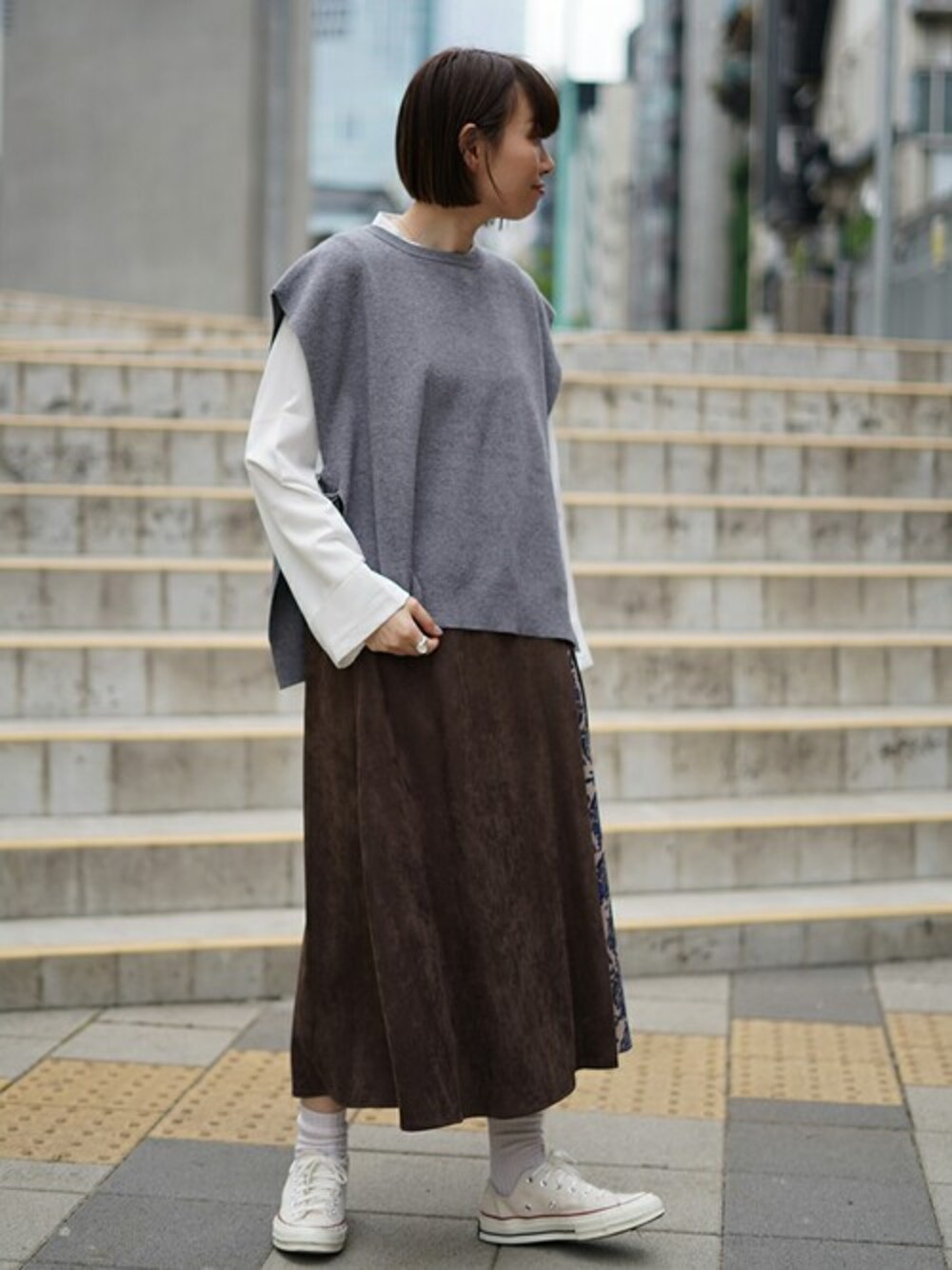 ニコルのアンサンブル「ニットベスト&シャツチュニック」を使ったコーディネート