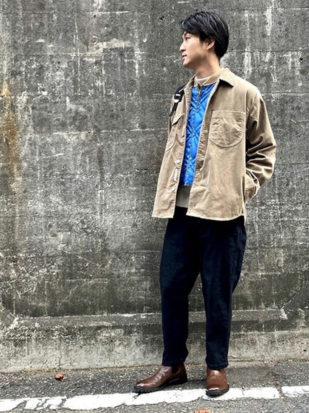 茶系のコーデュロイのアウターも、 インナーに発色良いブルーを入れてクリーンな印象に。 【BROOKLYNOVERALL Instagram:@brooklynoverall】
