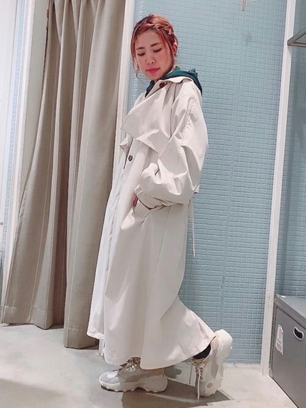 ホワイト系のトレンチコートを着用したレディースの冬コーディネートの1枚目の写真