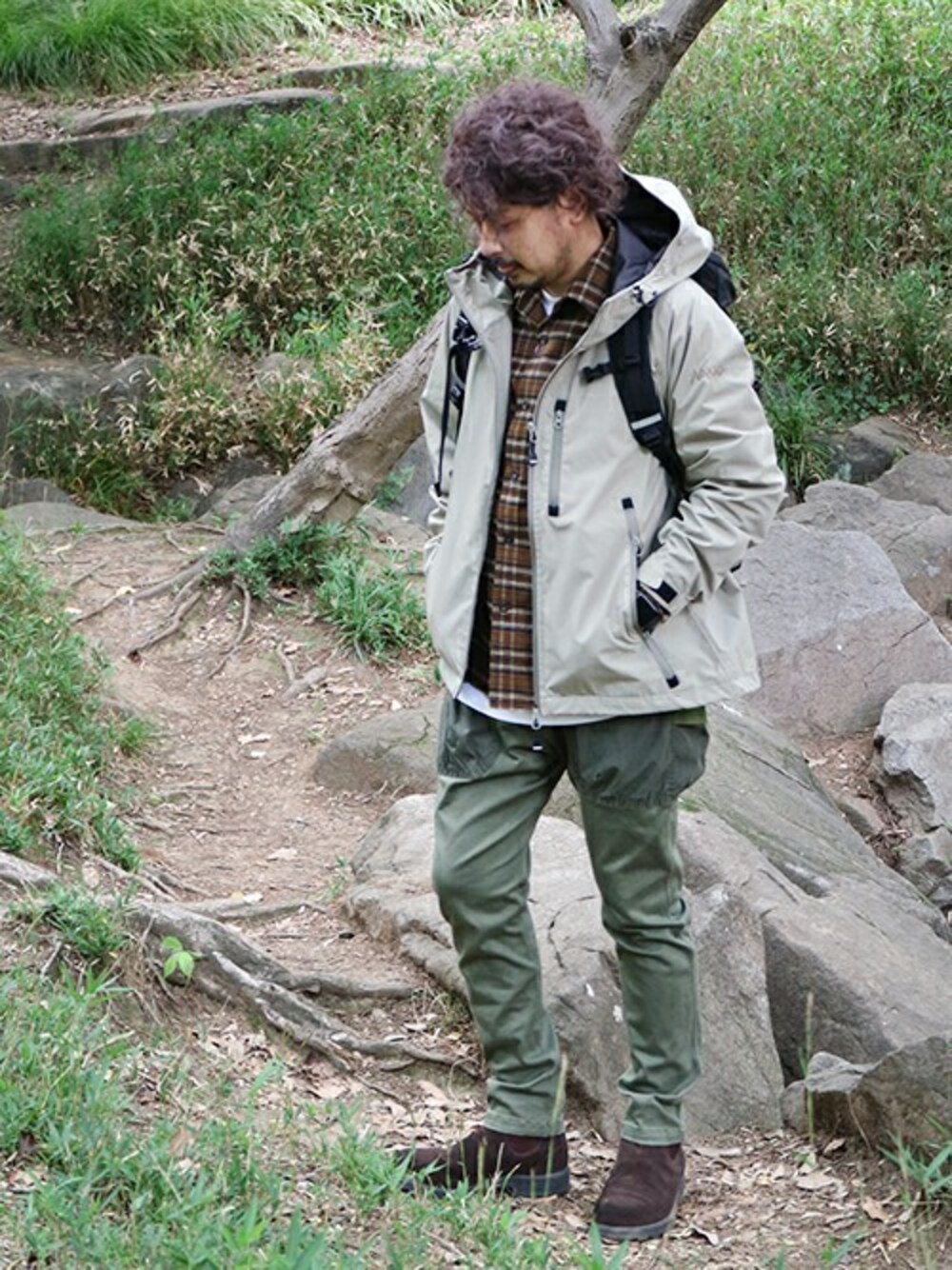 ベージュ系のブルゾンを着用したメンズの夏コーディネートの1枚目の写真