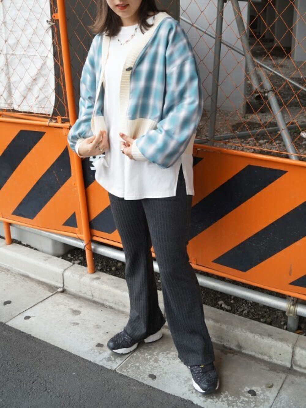 ニコルのカーディガン/ボレロ「チェックシャツリメイクカーディガン」を使ったコーディネート