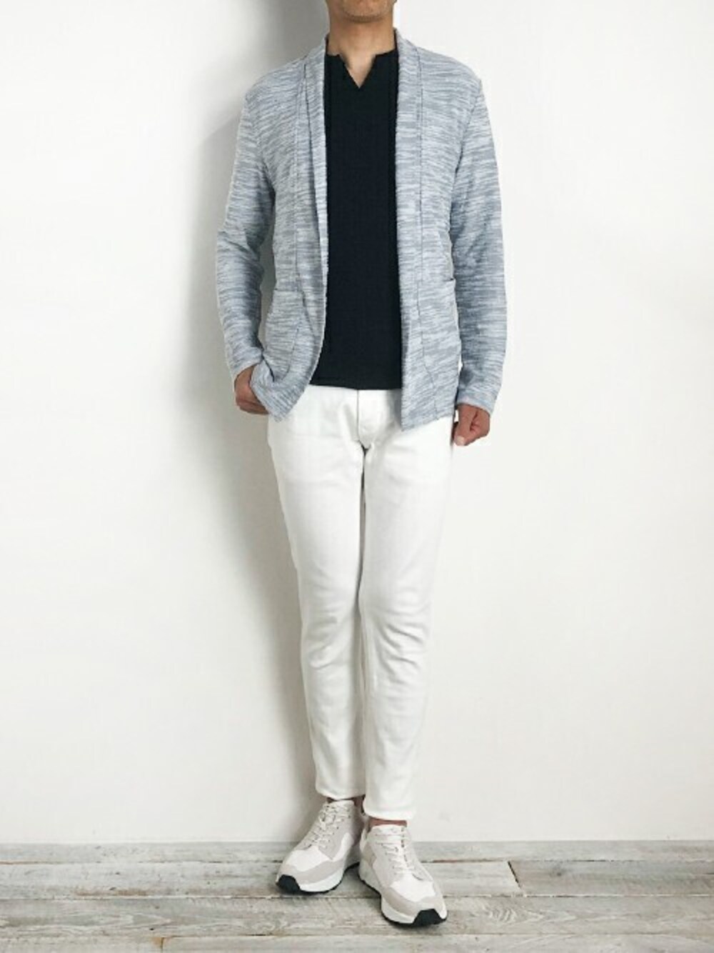 Cardigan Style。 小さめのショールカラーが特徴のカーディガンを羽織りました。 インナーのTシャツは、襟元のキーネックがポイントです。 ホワイトデニム&スニーカーで、軽快なスタイルをイメージしました。 【MONSIEUR NICOLE Instagram】 @monsieur.nicole