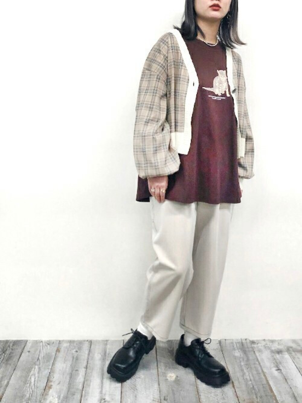 ニコルのカーディガン/ボレロ「チェックシャツリメイクカーディガン」を使ったコーディネート
