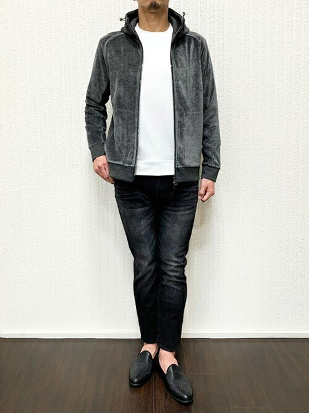 ニコル(ニコル本社)のパーカー「【ex/tra】ベロア ハイブリッドフーディ」を使ったコーディネート