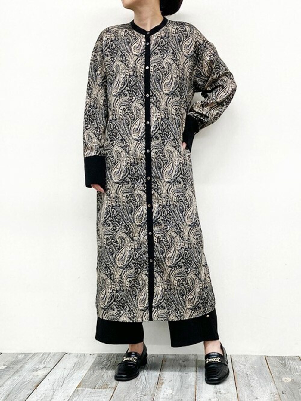 ニコルのワンピース「ペイズリー柄クレリック バンドカラー ワンピース」を使ったコーディネート