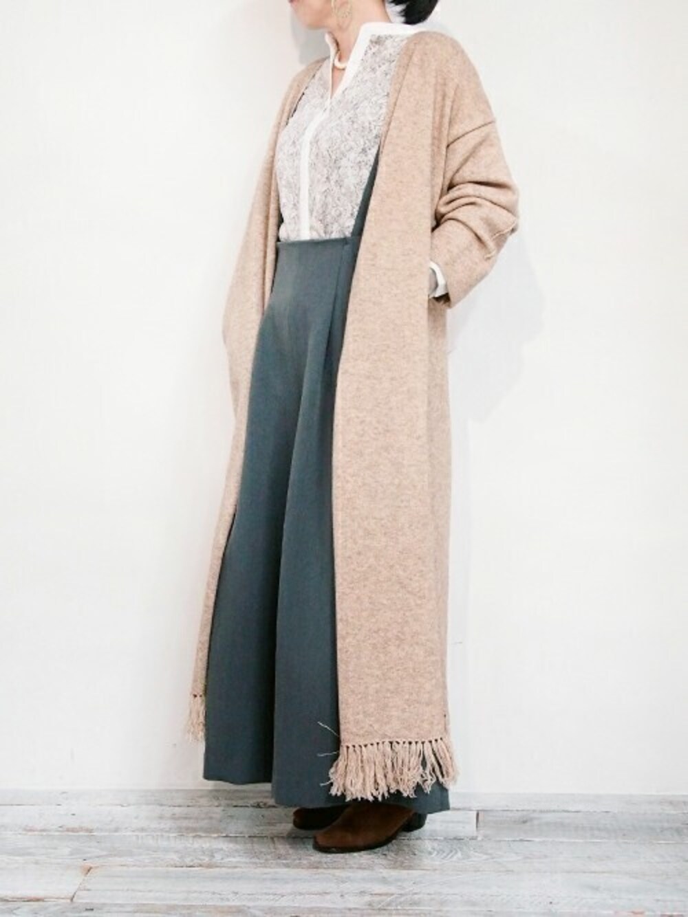 ニコルのカーディガン/ボレロ「裾フリンジ ボタンレス ロングカーディガン」を使ったコーディネート