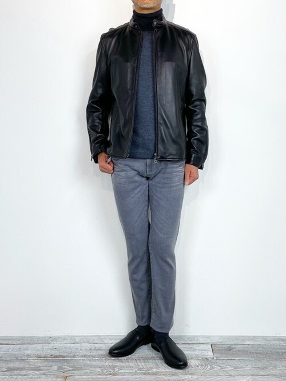 Sheep Leather Style 程良い光沢と張り感が特徴のSheep Leather を使用したライダースブルゾンを、タートルニットと合わせました。 グレーからブラックのモノトーンでシックにコーディネイトしました。 Biella Yarn(ビエラヤーン)社の エクストラファインメリノウールを使用したタートルネックニット¥19,800 【MONSIEUR NICOLE Instagram】 @monsieur.nicole