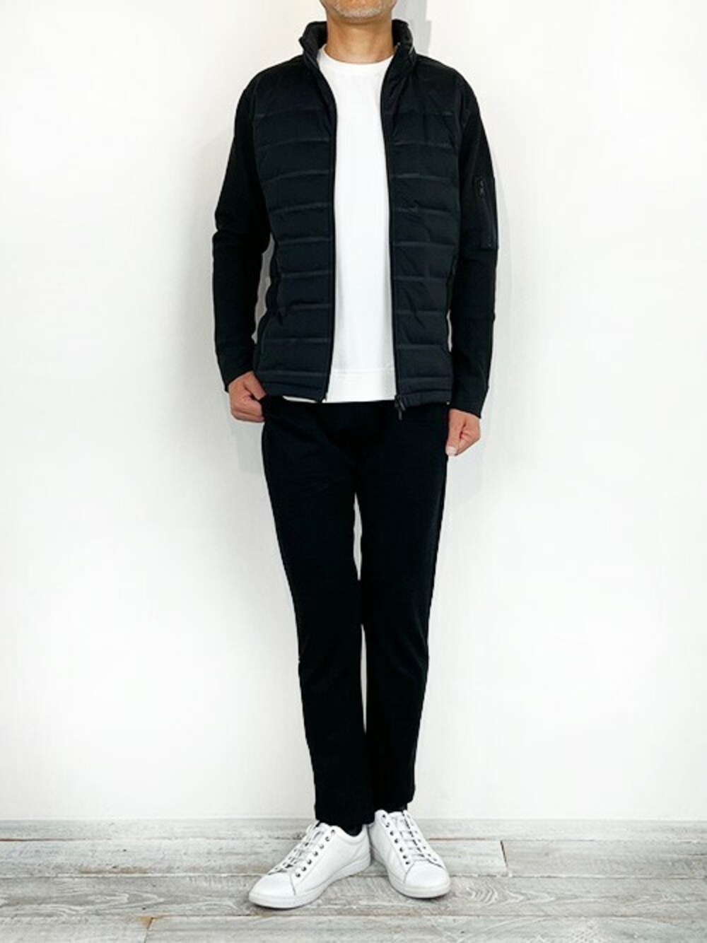 Sporty Combination Style ニット素材で袖を切り替えた中綿ブルゾンを着用しました。中綿の押え部分は、ステッチレスの圧着シームレス。 防風、軽撥水機能にスポーツテイストをプラスしたスタイリングです。 【MONSIEUR NICOLE Instagram】 @monsieur.nicole