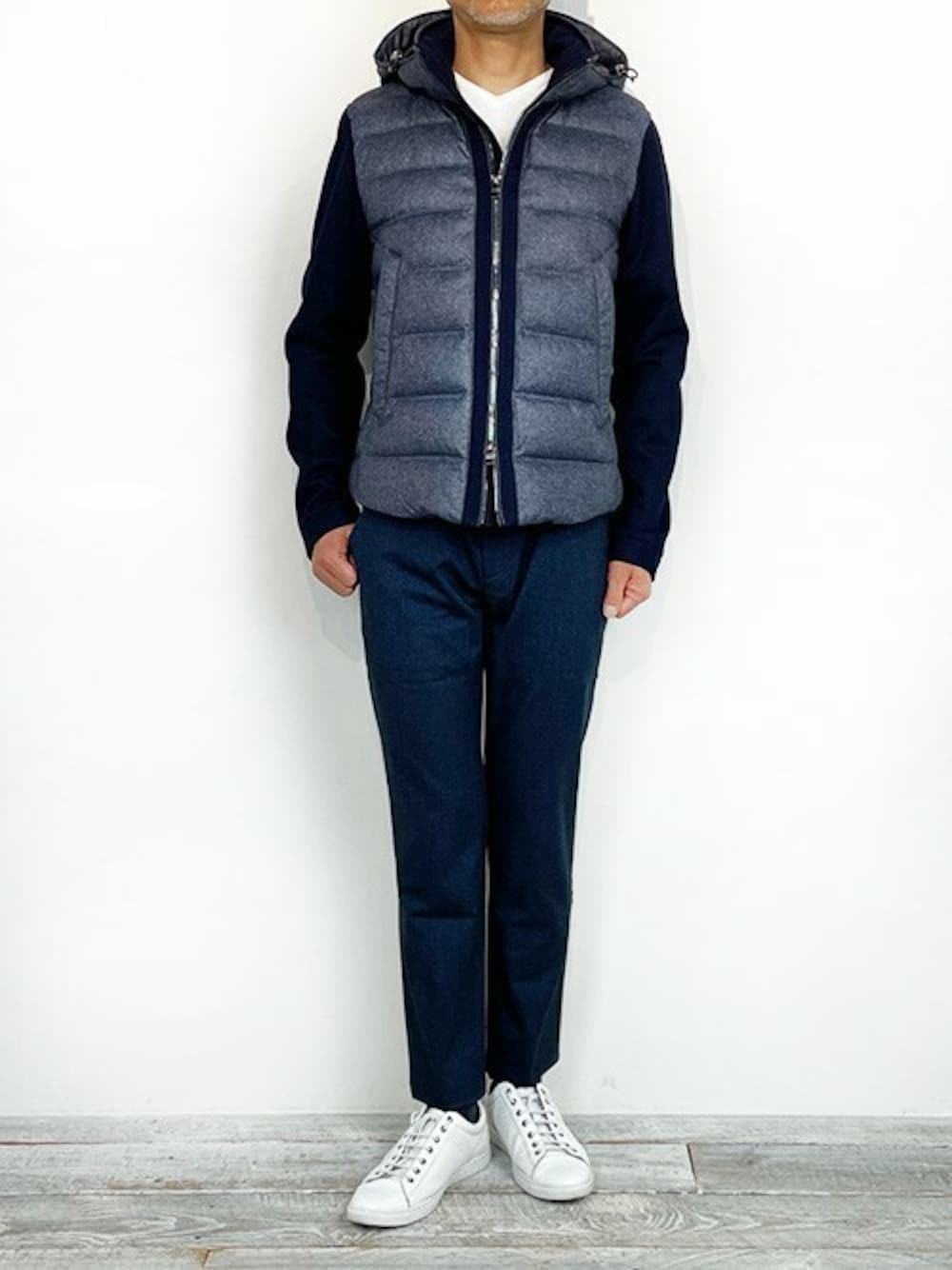 Combination Down メランジシャンブレーツイルを使用したコンビネーションダウンです。 袖部分は、キックバック性の良いジャージ素材を使用しており、着用感抜群です。 パンツは、SOFTTHERMO機能素材を使用したテーパードパンツを合わせました。 【MONSIEUR NICOLE Instagram】 @monsieur.nicole
