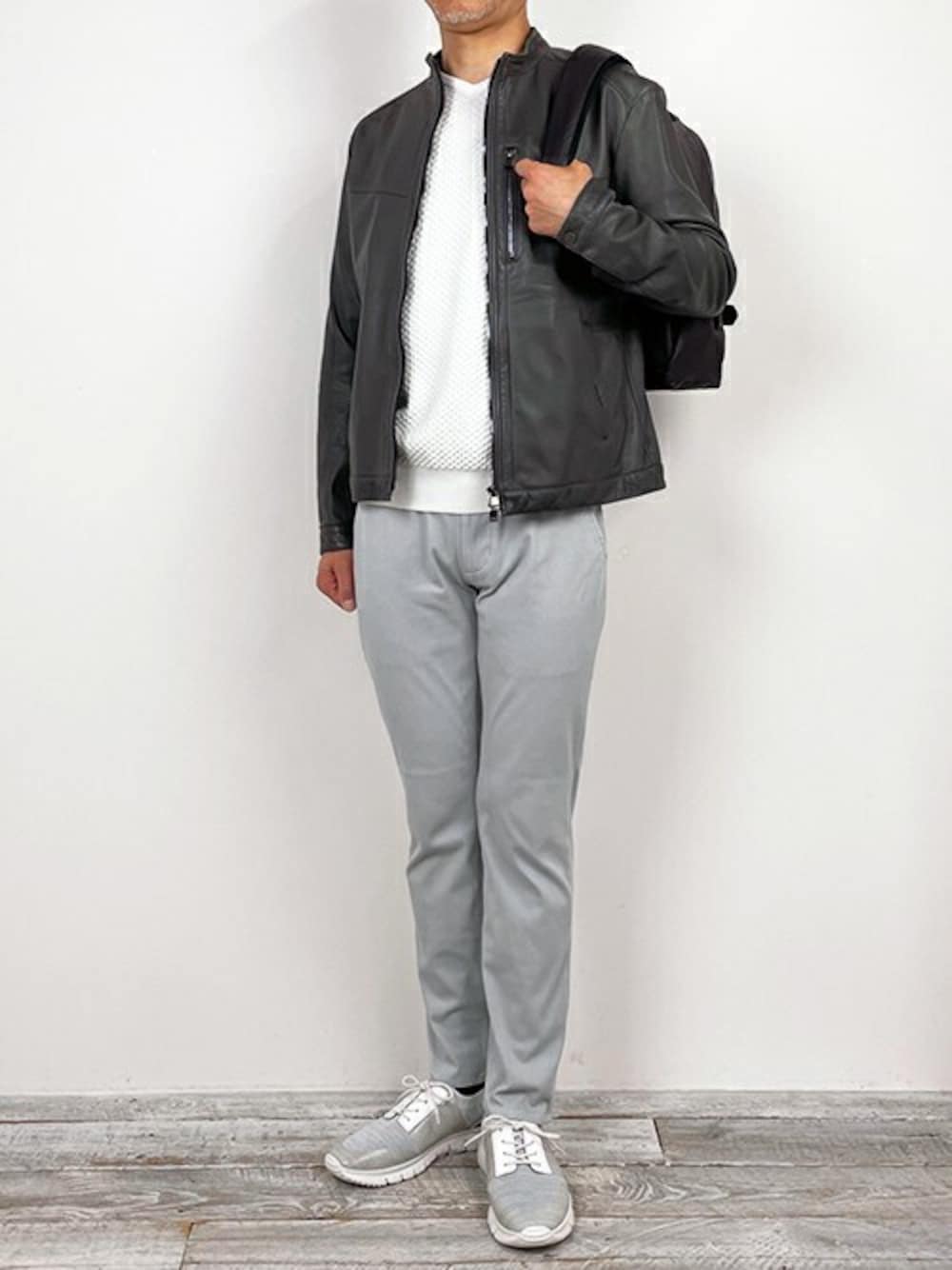 Leather Riders Style 上質なSheepレザーを使用したシングルライダースブルゾンで春を先取り。 ジャージデニムを合わせて、スポーティなコーディネイトを目指しました。 バッグパックはミニマルなサイズ感です。 【MONSIEUR NICOLE Instagram】 @monsieur.nicole
