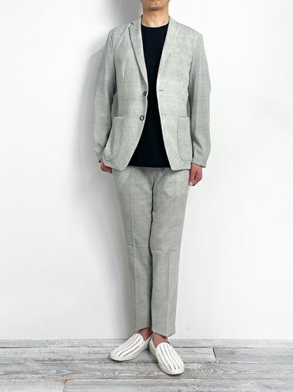 Casual Set-up Style プリントサッカーストレッチ素材を使用したセットアップを着用しました。 ブラックカットソーを合わせ、COOLな着こなしを目指しました。 ジャケット¥35,200 パンツ¥19,800 【MONSIEUR NICOLE Instagram】 @monsieur.nicole