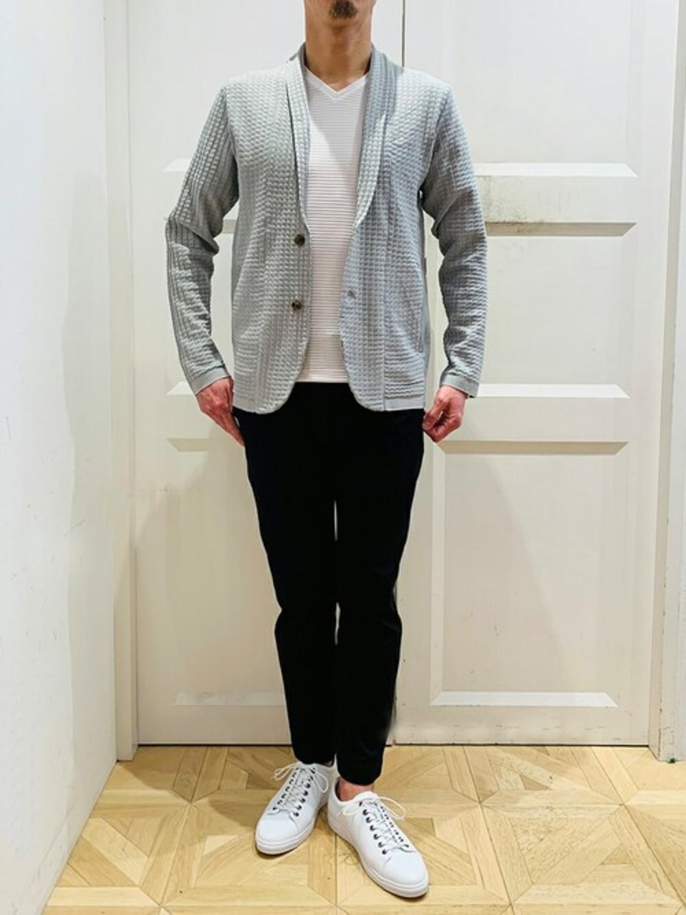 ニコル(ニコル本社)のTシャツ/カットソー「ジオメトリックジャカード ショールカラーニットカーディガン」を使ったコーディネート