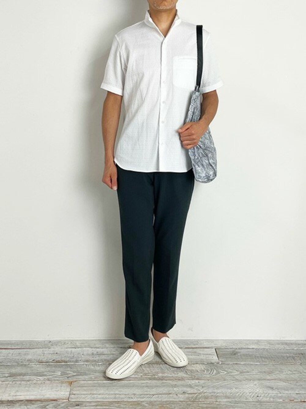 Summer シャツスタイル ソロテックス糸を使用した西脇シャツ地を使用した半袖シャツを着用しました。 パンツは、吸汗速乾機能を持ったEVALET@素材を使用したサッカーストライプパンツを合わせました。 シャツ\18,700 パンツ\19,800 スリッポン\19,800 【MONSIEUR NICOLE Instagram】 @monsieur.nicole