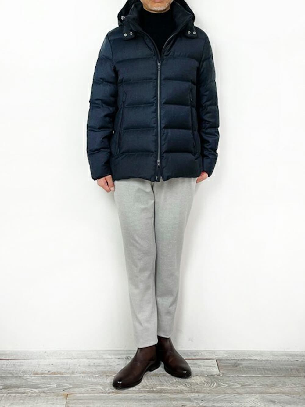 Down Blouson Style ダウン¥88,000 ニット\30,800 パンツ\29,700 イタリアCanonico(カノニコ)社の ウールツイルを使用したダウンブルゾンを着用しました。 タートルネックとジャージスラックスを サイドゴアブーツと合わせ、大人なカジュアルスタイルを目指しました。 【MONSIEUR NICOLE Instagram】 @monsieur.nicole