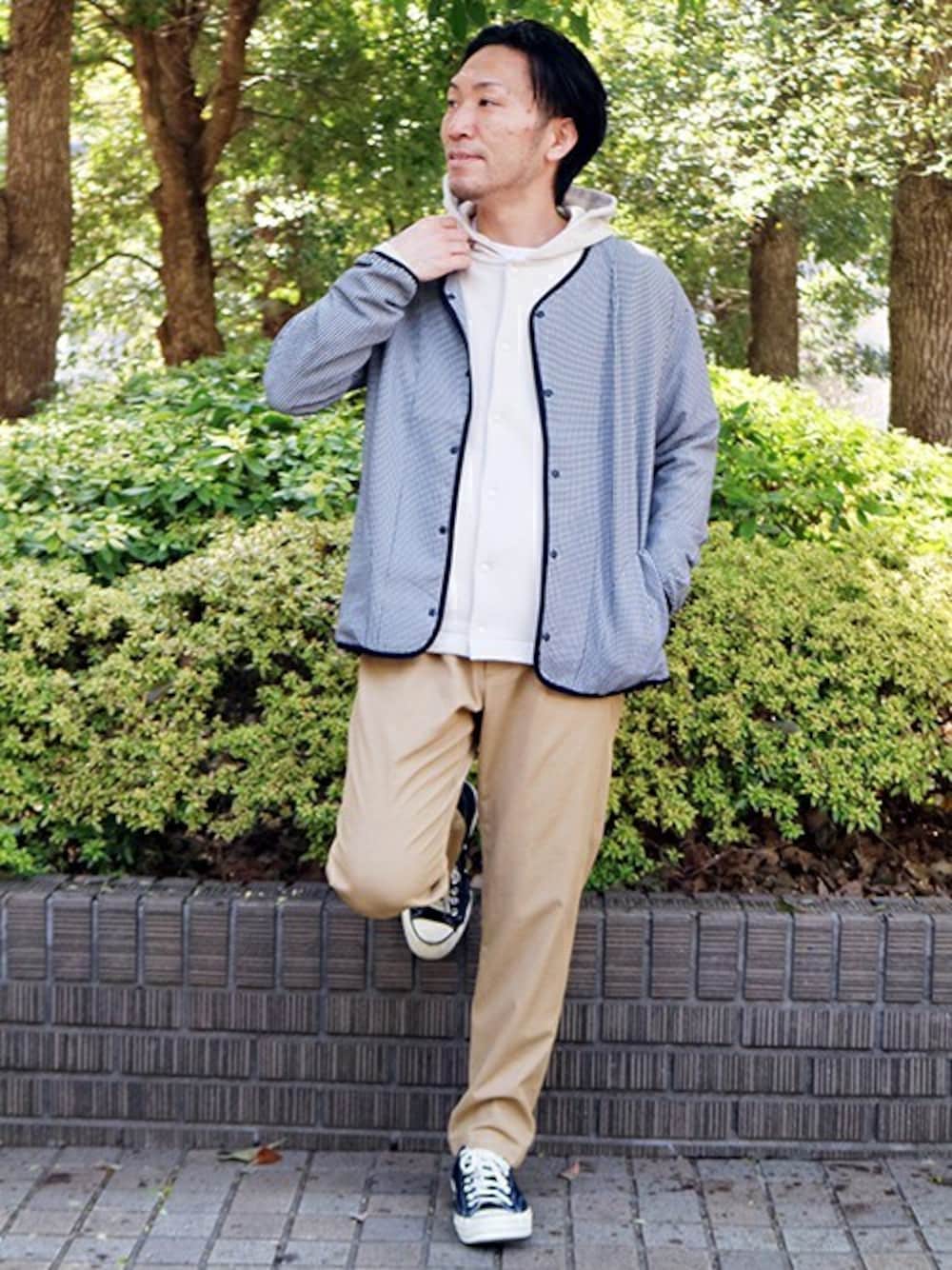 ニコルのライダースジャケット「ギンガムサッカーノーカラーブルゾン」を使ったコーディネート