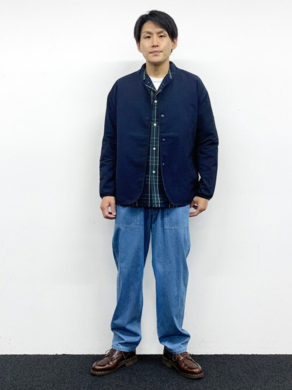 ニコルのライダースジャケット「ギンガムサッカーノーカラーブルゾン」を使ったコーディネート