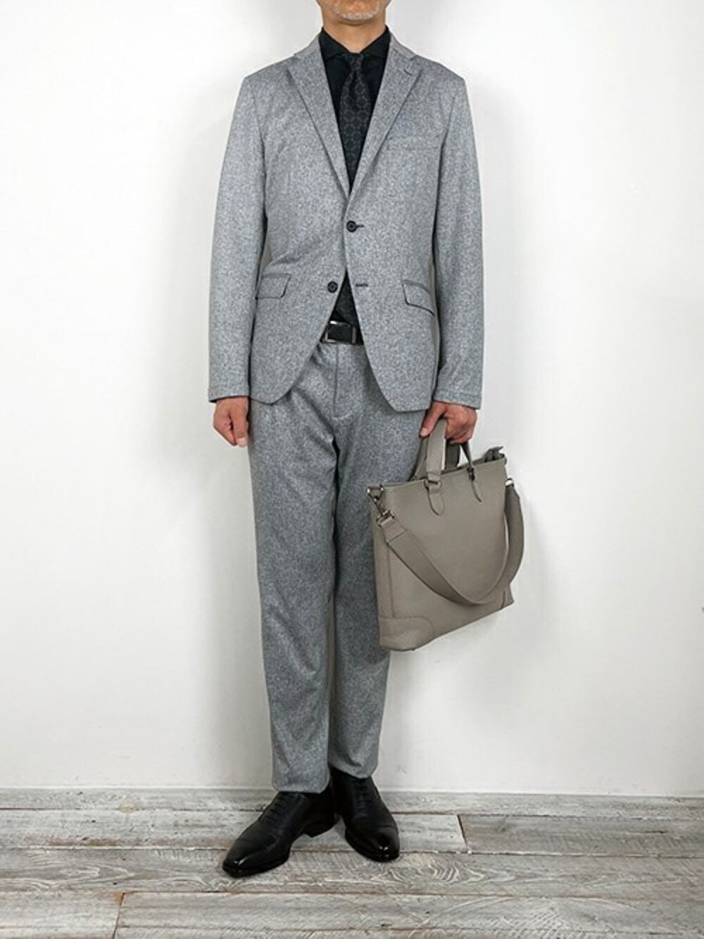 Tied-up Style 衿裏にタブベルトが付いたコンバーチブルジャケットに、 ドローコードが付いたテーパードパンツを、Set-upスタイルで着用しました。 素材は、抜群のストレッチ性を備えたメランジトリコットです。 光沢あるPeブラックシャツに、スクエア模様が特徴の日本製ネクタイでドレスアップしました。 【MONSIEUR NICOLE Instagram】 @monsieur.nicole
