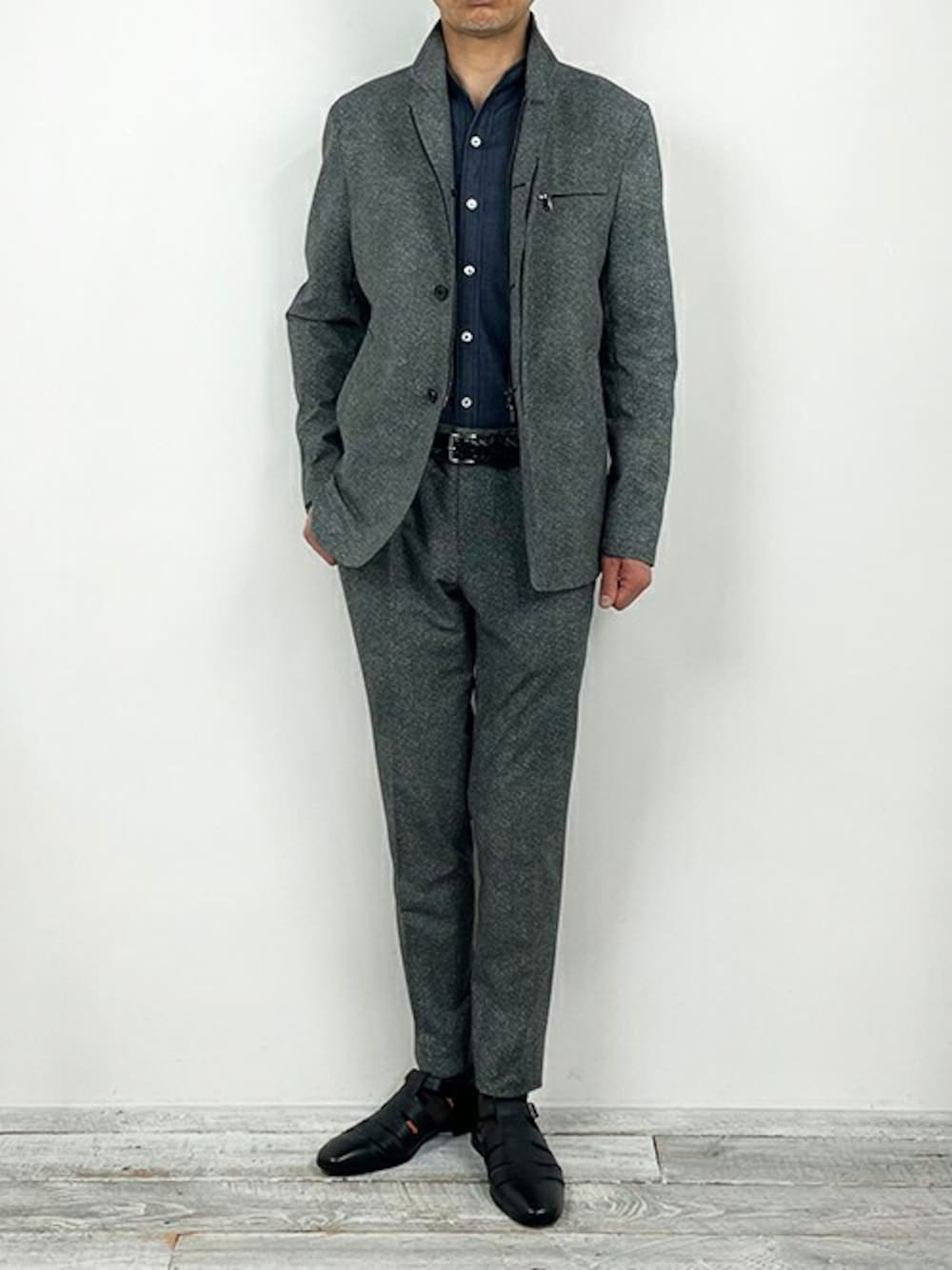 Casual Set-up Style フロントにZIPが付いたスタンドカラータイプのコンバーチブルジャケットを、セットアップスタイルで着用しました。 使用している素材は、COOLDOTS®素材で、通気性や吸収速乾性など夏に向けてありがたい機能満載の素材です。 インナーには、イタリアAlbiate社の素材を使用したデニムシャツを合わせトレンドも意識しました。