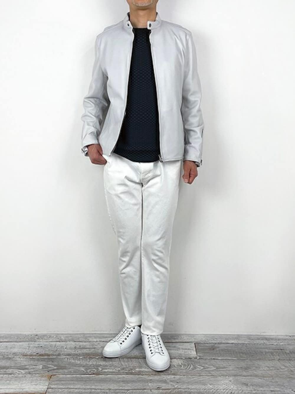 Leather Style 上質なSheepレザーを使用した、シンプルなライダースを、スリムシルエットデニムで合わせました。 春らしいモノトーンカラーでコーディネイトしました。