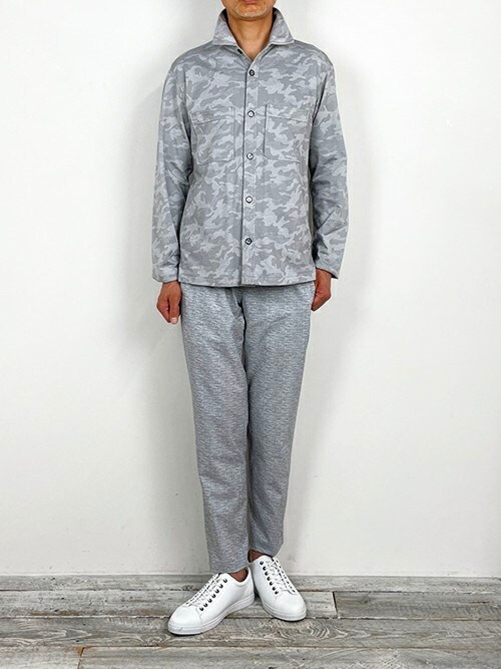 Shirt Outer Style カモフラジャカードニットのシャツブルゾンを着用しました。 パンツは、MNオリジナルプリントを施したサッカートラックパンツを合わせました。 【MONSIEUR NICOLE Instagram】 @monsieur.nicole