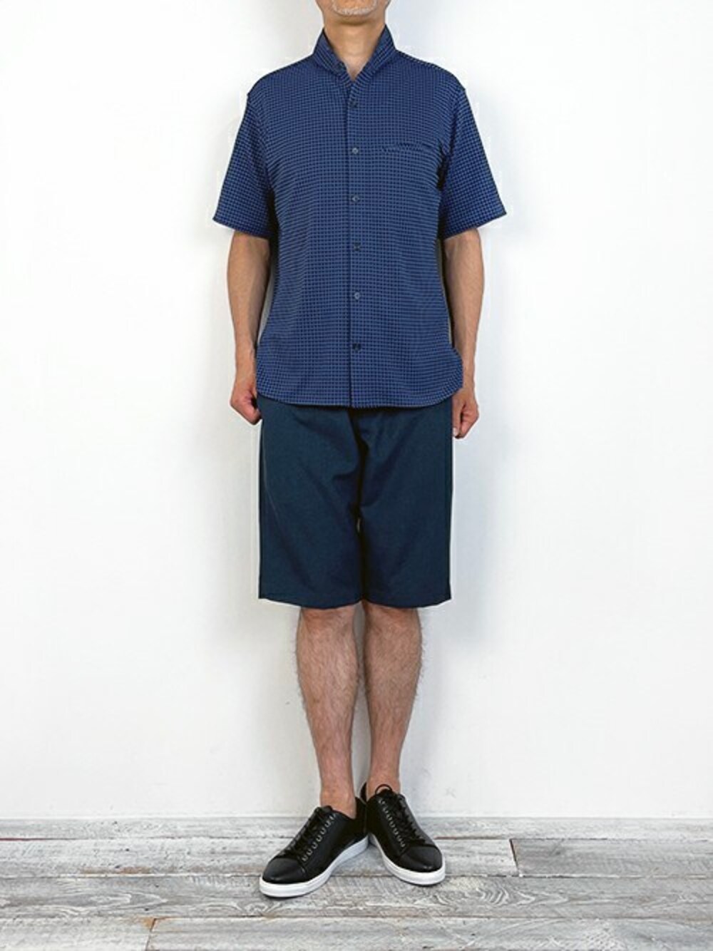 Gimgham check knit Shirt 布帛のようなギンガムニットシャツを着用しました。 張りとストレッチ性の両方があり綺麗に着用できます。 今回はハーフパンツと組み合わせました。
