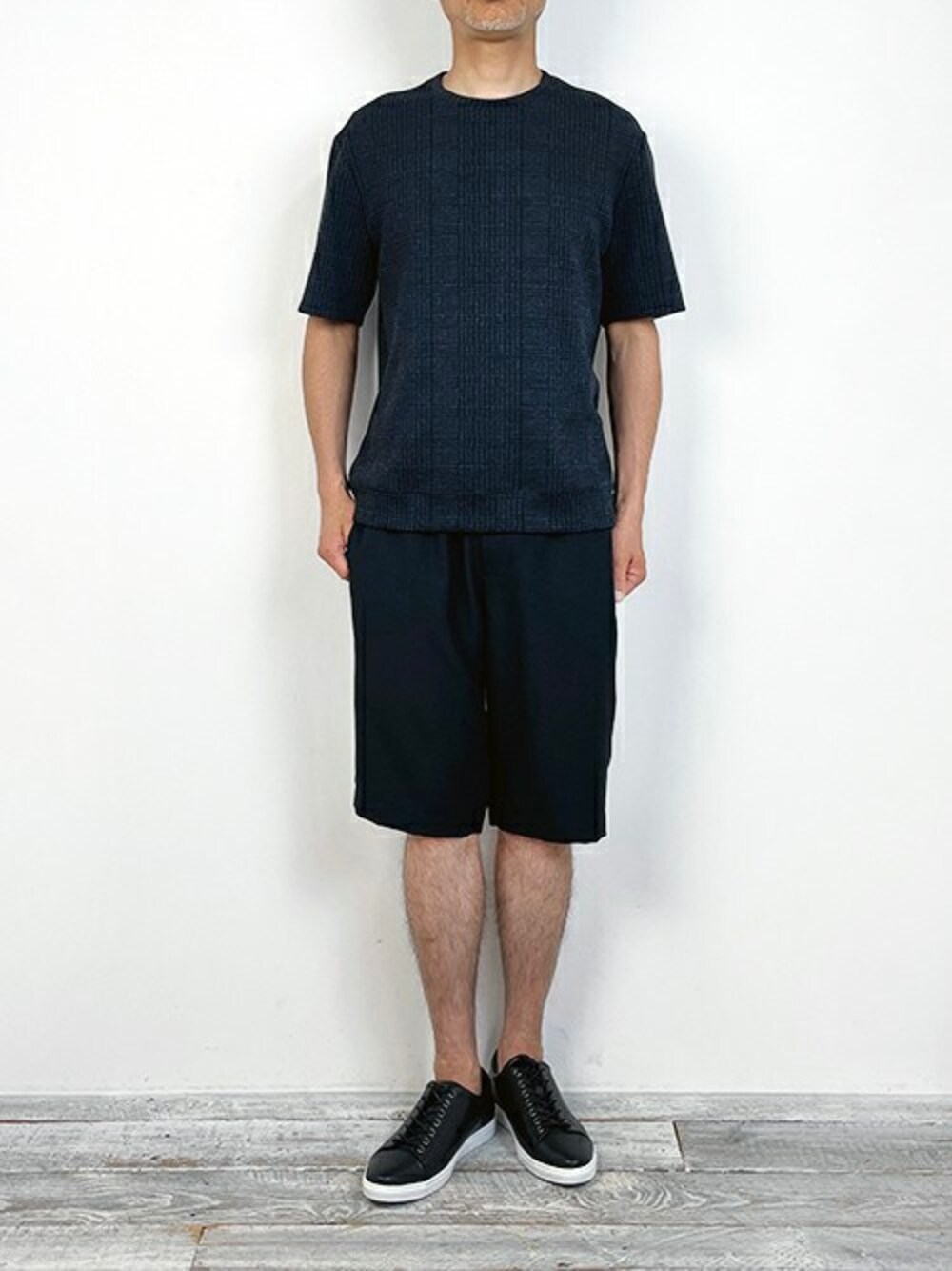 Glencheck Knit-T 独特な膨らみがあるグレンチェックニット-Tを着用しました。 同系色ショーツでクールなコーディネイトを目指しました。